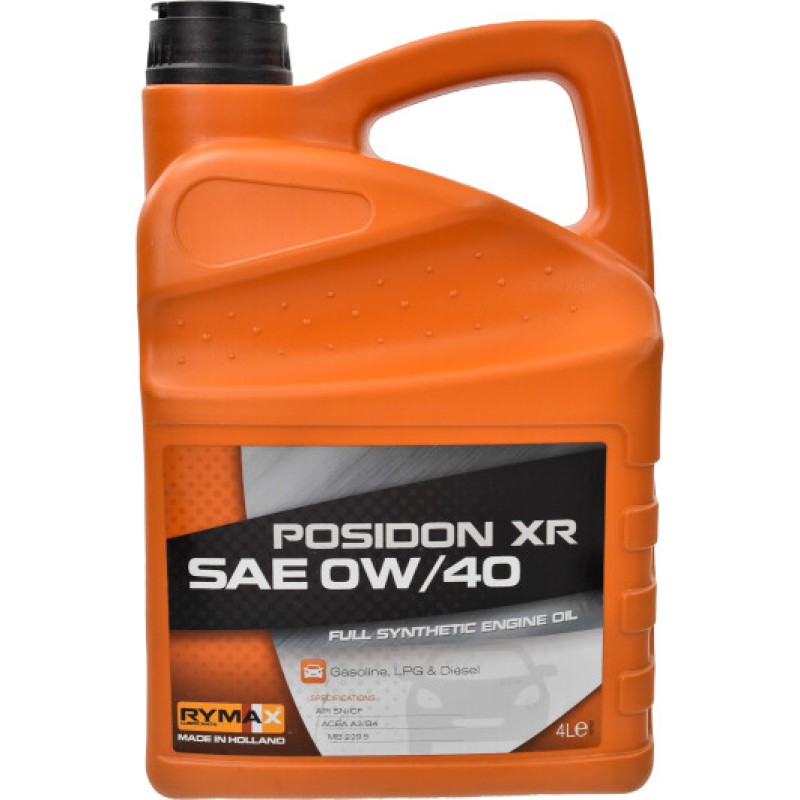 олива, вироблене на синтетичній основі, розроблене для універсального застосування в сучасних моторах, в тому числі моделях з турбонагнітачами, легкових автомобілів, позашляховиків, фургонів і легких вантажівок, яким виробниками рекомендується використання масел рівня АСЕА А3/В4 або API SN/CF. Розроблено з додаванням унікального комплексу присадок, які забезпечують збільшення інтервалів між замінами масла, зводять до мінімуму відкладення в двигуні, вихлопній системі і турбіні, підвищення потужності двигуна та його крутного моменту. Відрізняється чудовою термоокислительной стабільністю, за рахунок чого мінімізує утворення нагару і відкладень, а також збільшується період експлуатації двигуна і самого масла. Продукт RYMAX Posidon XR (Syrinx) 0W-40 4л повністю відповідає вимогам виробників автомобілів і володіє фірмовими допусками.
