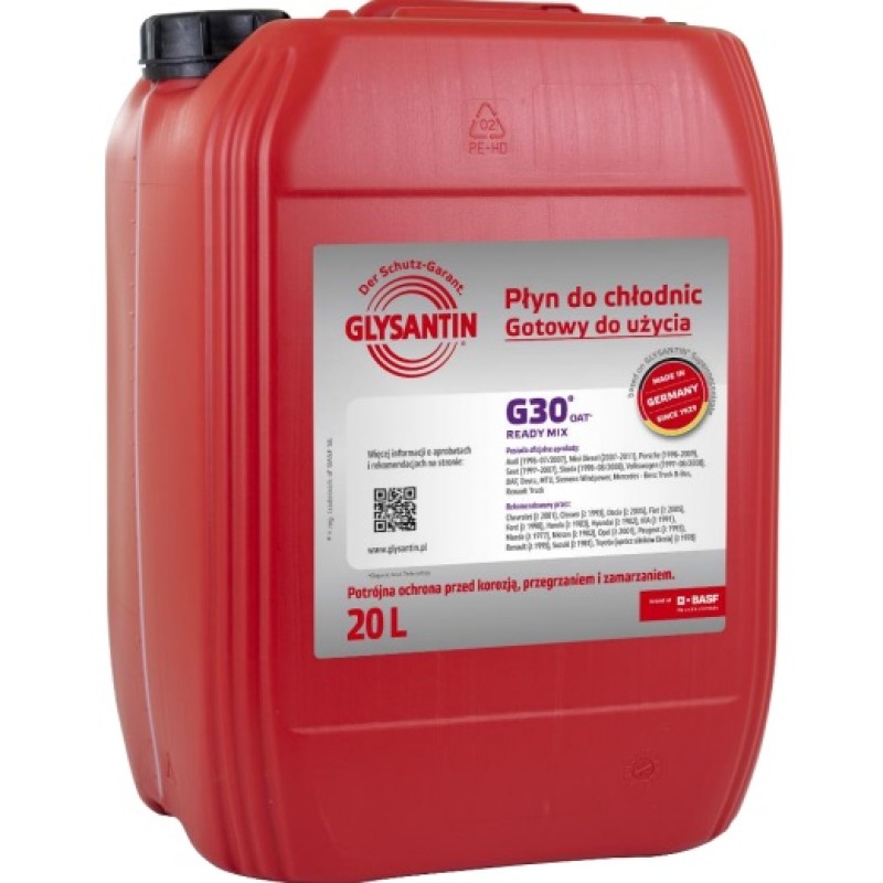 GLYSANTIN® G30® - антифриз найвищої якості, що не містить силікатів. Продукт ґрунтується на технології органічних кислот (OAT). Містить органічні інгібітори корозії, що захищають систему охолодження. Антифриз GLYSANTIN® G30® рожевого кольору. Офіційні дозволи: Audi (TL 774-D/F), Bentley (TL 774-D/F), DAF (MAT 74002), Deutz (DQC CB-14), Ferrari (≥ 2010), Lamborghini (TL774-D/F), MAN (MAN 324 SNF), Mercedes-Benz Truck & Bus (MB-Approval 325.3), Mercedes-Benz Truck & Bus (MB-Approval 326.3 (Ready Mix)), Mini (BMW LC-07), MTU (MTL 5048), Porsche (TL 774-D/F), Seat (TL 774-D/F), SETRA (MB-Approval 326.3), SETRA (MB-Approval 326.3 (ReadyMix)), Siemens Windpower, Skoda (TL 774-D/F), Volkswagen (VW) (TL 774-D/F) Також відповідає: Alfa Romeo (≥ 2006), Aprilia, Chrysler (≥ 2011), Citroen (≥ 1993), Dacia (≥ 2005), Daewoo, Daihatsu (≥ 1979), Dodge (≥ 2011), Fiat (≥ 2005), Ford (≥ 1998), Fuso, Gilera, GMC, Harley-Davidson, Hitachi, HONDA (≥ 1983), HONDA Motorbike, Hyundai (≥ 1982), Iveco (≥ 01/20