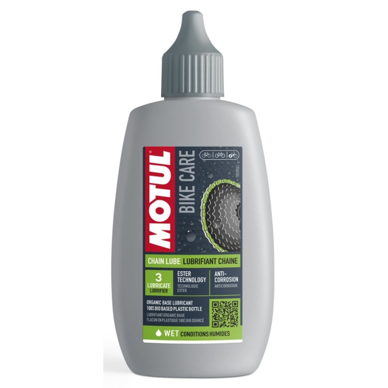 MOTUL® Chain Lube Wet — це мастильний матеріал на органічній основі, що використовує невикопну відновлювальну сирову, підсилений складноефірною базовою оливою для забезпечення протизношувальних властивостей. Технологія Ester має оптимізовану полярність для максимальної адгезивності на ланцюгу. Це знижує коефіцієнт тертя та втрату потужності, що забезпечує плавність роботи, також знижує шумність роботи, особливо в умовах високої вологості.